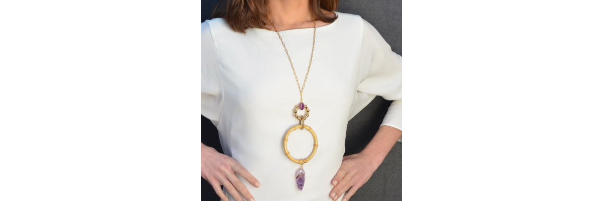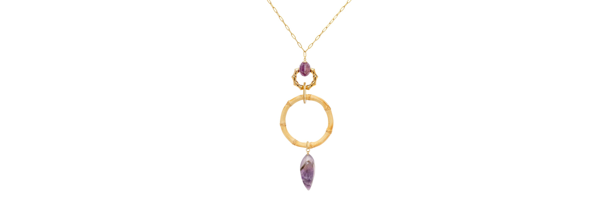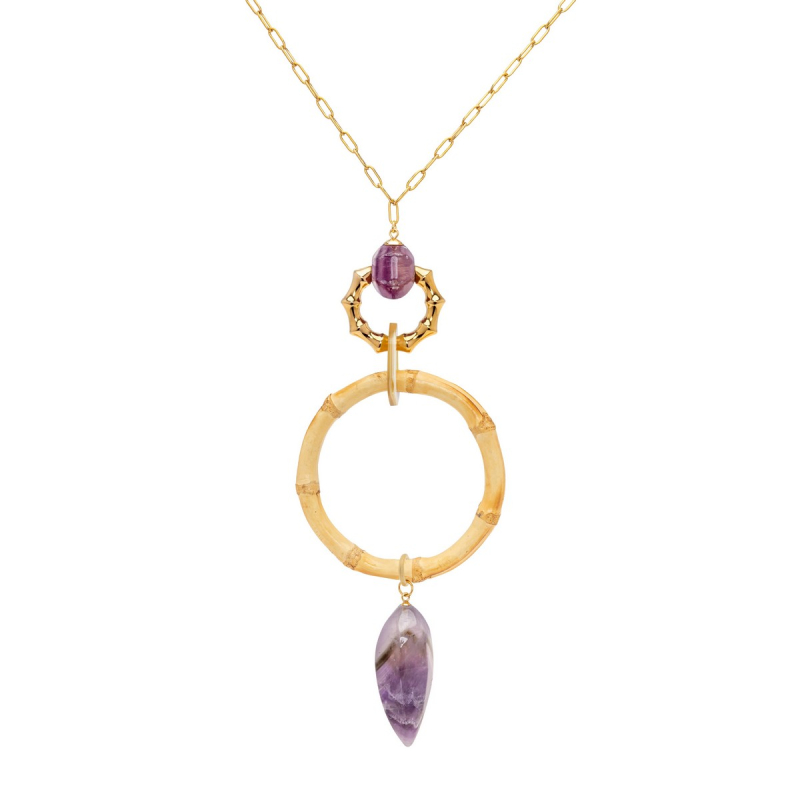 Collar Connie con un gran colgante central formado por dos aros de acero bañado en oro y bambú, fluorita y amatista, colgado de una cadena de eslabones cuadrados. -Peso 78g -Longitud 50cm -Metal: acero bañado en oro -Al ser materiales naturales y estar trabajados a mano, pueden variar ligeramente en tamaño, forma y color.