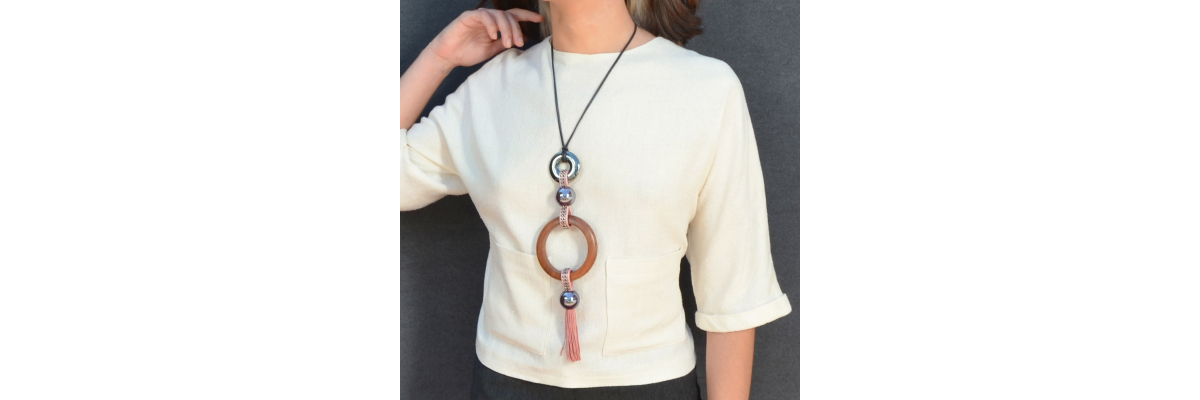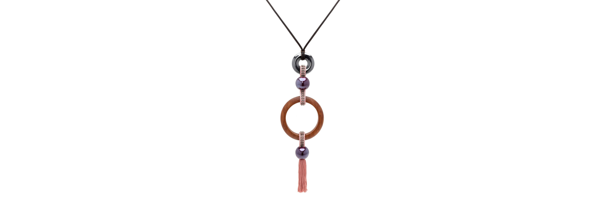Collar Kora regulable con cordón de cuero cosido, madera de bayong, cuero rosa con tachuelas, hematite, cerámica y borla de seda rosa. -Peso 105 g -Longitud ajustable de 45 a 50 cm -Al ser materiales naturales y estar trabajados a mano, pueden variar ligeramente en tamaño, forma y color.