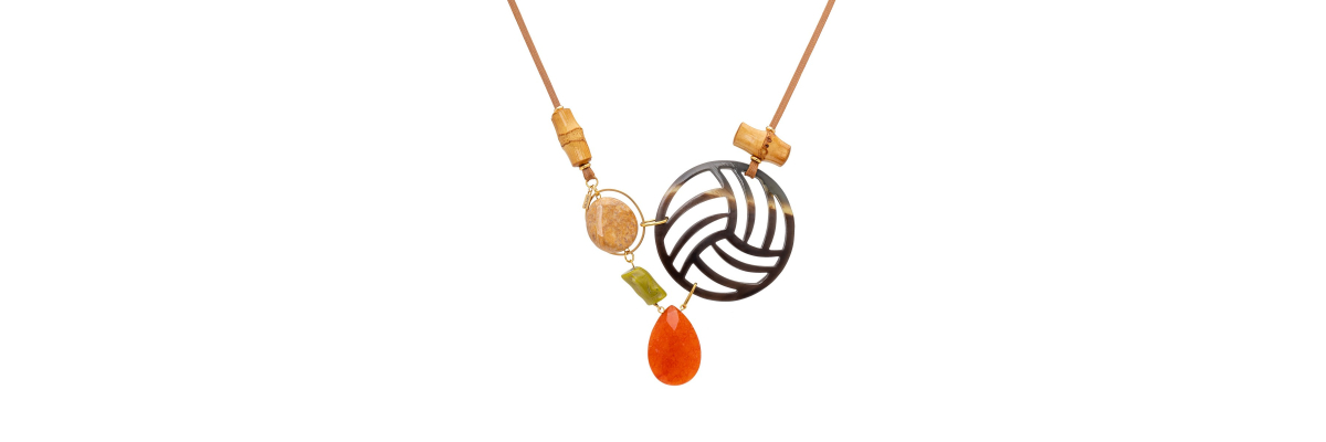 Collar asimétrico Olivia corto con cuerno, lágrima de ágata, bambú, coral y jaspe amarillo. Termina con una cinta de algodón marrón incrustada en dos piezas de bambú. -Peso 71 g -Longitud 32 cm -Metal: acero bañado en oro -Al ser materiales naturales y estar trabajados a mano, pueden variar ligeramente en tamaño, forma y color.