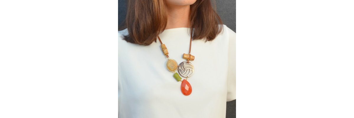 • Short asymmetrical Olivia necklace with horn, agate teardrop, bamboo, coral and yellow jasper. It ends up with a brown cotton ribbon embedded in two pieces of bamboo.