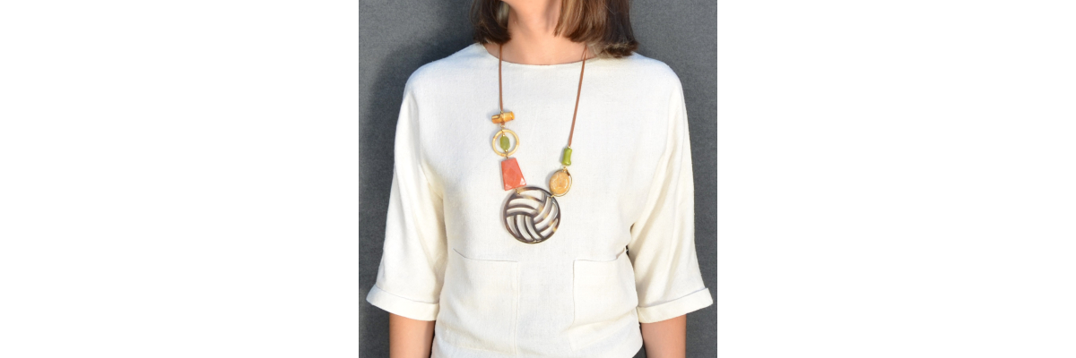 Collar asimétrico Olivia de largo medio con cuerno, ágata, bambú, coral y jaspe amarillo. Termina con una cinta de algodón marrón incrustada en dos piezas de bambú. -Peso 76 g -Longitud 40 cm -Metal: acero bañado en oro -Al ser materiales naturales y estar trabajados a mano, pueden variar ligeramente en tamaño, forma y color.