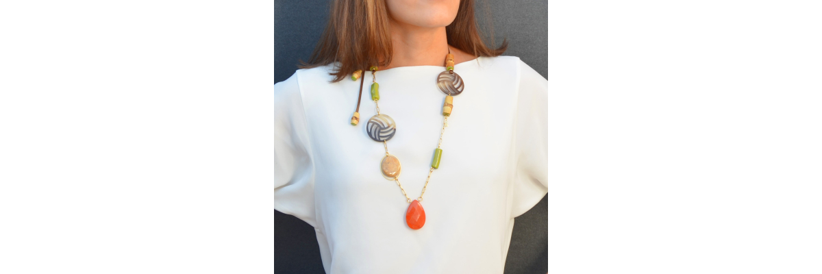 Collar asimétrico Olivia largo con cadena cuadrada, cuerno, ágata, bambú, coral y jaspe amarillo. Termina con una cinta de algodón marrón incrustada en dos piezas de bambú. -Peso 65 g -Longitud 47 cm -Metal: acero bañado en oro -Al ser materiales naturales y estar trabajados a mano, pueden variar ligeramente en tamaño, forma y color.