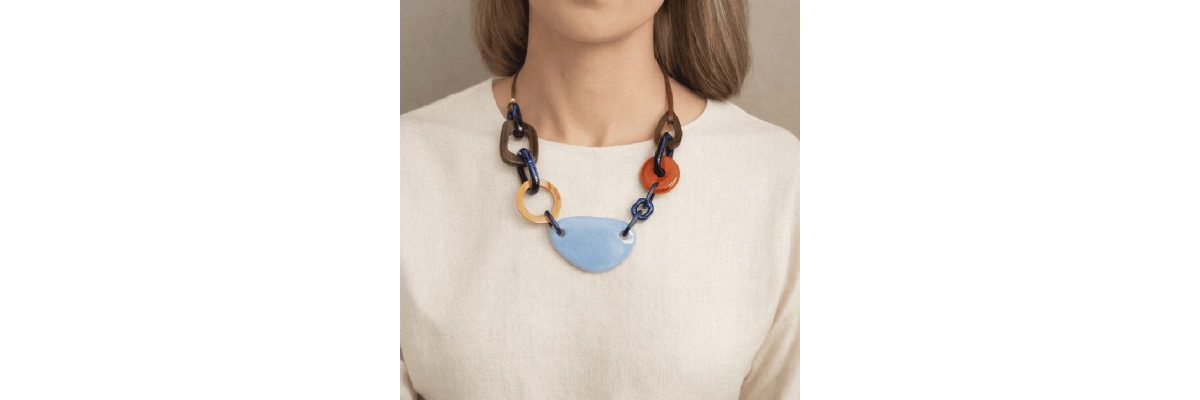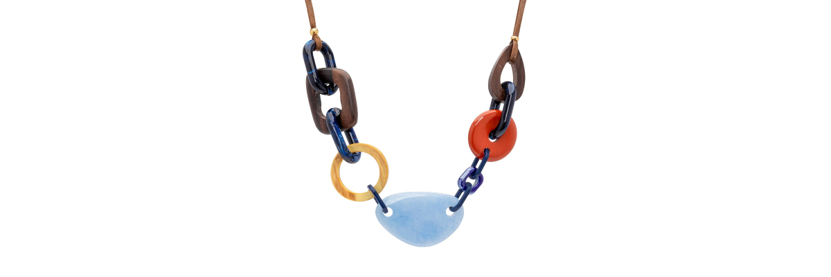 Collar Aline de una vuelta con madera de ébano de diferentes formas, resina al agua, ágata y jaspe rojo y termina con cinta de algodón marrón chocolate y ébano. -Peso 80 g -Longitud 26 cm regulable en 5 cm -Metal: acero bañado en oro -Al ser materiales naturales y estar trabajados a mano, pueden variar ligeramente en tamaño, forma y color.