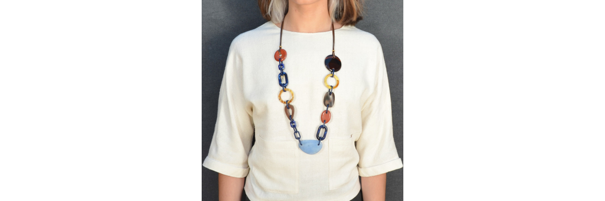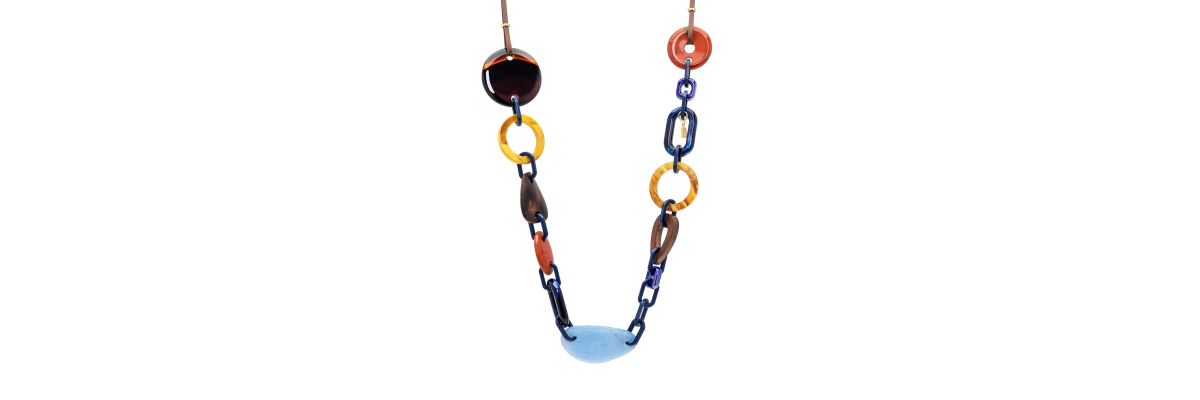 • Aline necklace with agate, water-based resin, red jasper and ebony wood. It ends with a brown cotton ribbon.