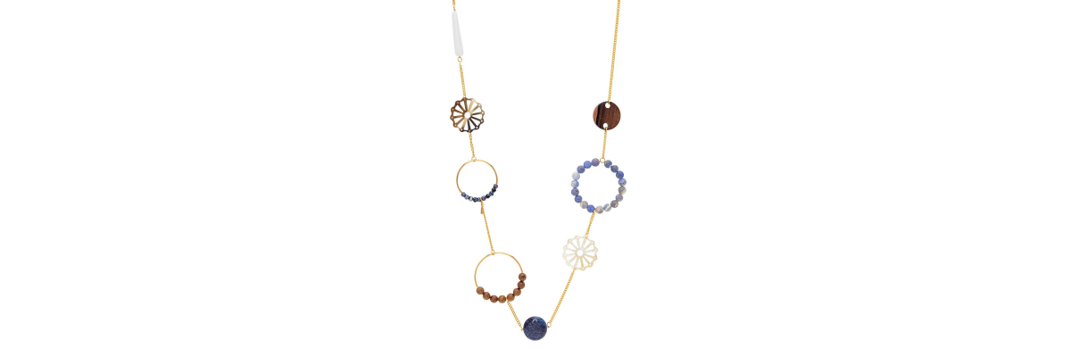 Collar Dante con piezas de cuerno, cerámica, madera de ébano y de bayong, ágata y lapislázuli. -Peso 90 g -Longitud 47 cm -Metal: acero bañado en oro -Al ser materiales naturales y estar trabajados a mano, pueden variar ligeramente en tamaño, forma y color.