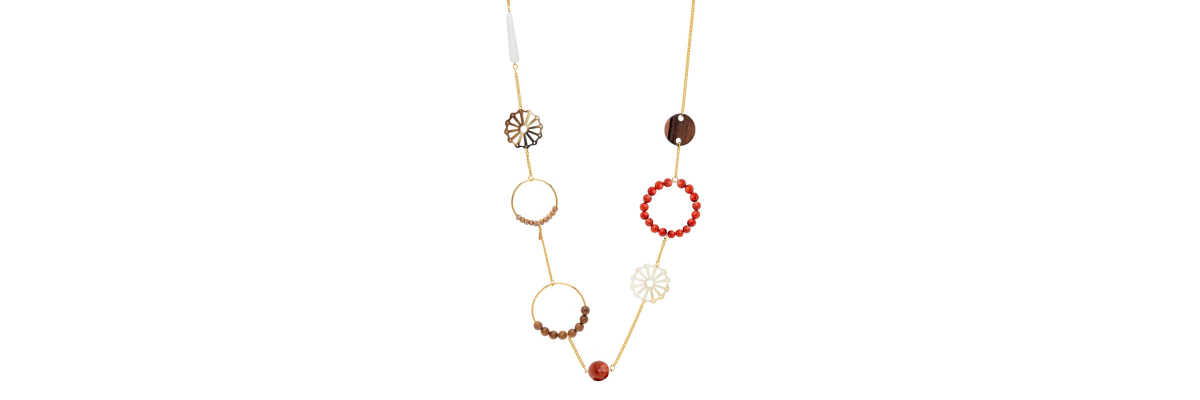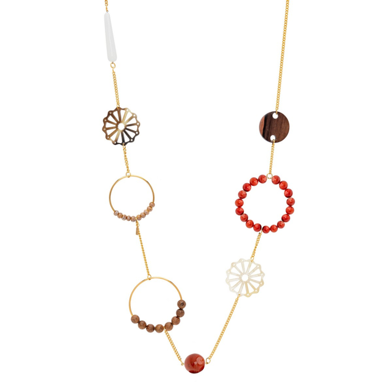 Collar Dante con piezas de cuerno, cerámica, madera de ébano y de bayong, ágata y coral. -Peso 90 g -Longitud 47 cm -Metal: acero bañado en oro -Al ser materiales naturales y estar trabajados a mano, pueden variar ligeramente en tamaño, forma y color.