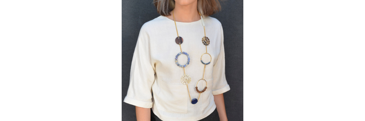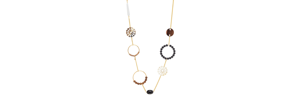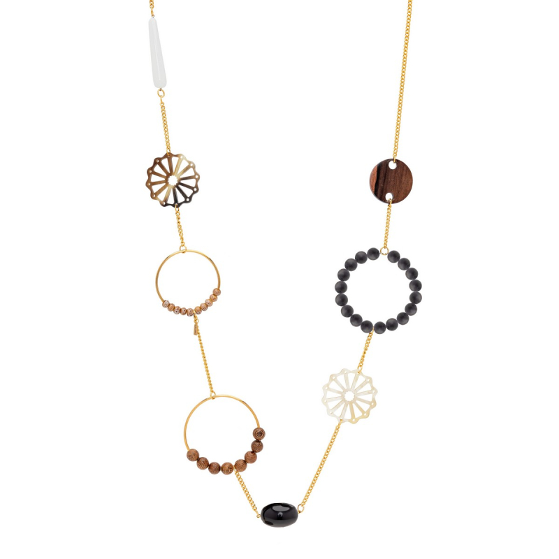 Collar Dante con piezas de cuerno, cerámica, madera de ébano y de bayong, ágata y ónix. -Peso 90 g -Longitud 47 cm -Metal: acero bañado en oro -Al ser materiales naturales y estar trabajados a mano, pueden variar ligeramente en tamaño, forma y color.