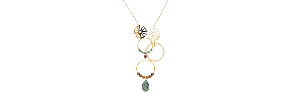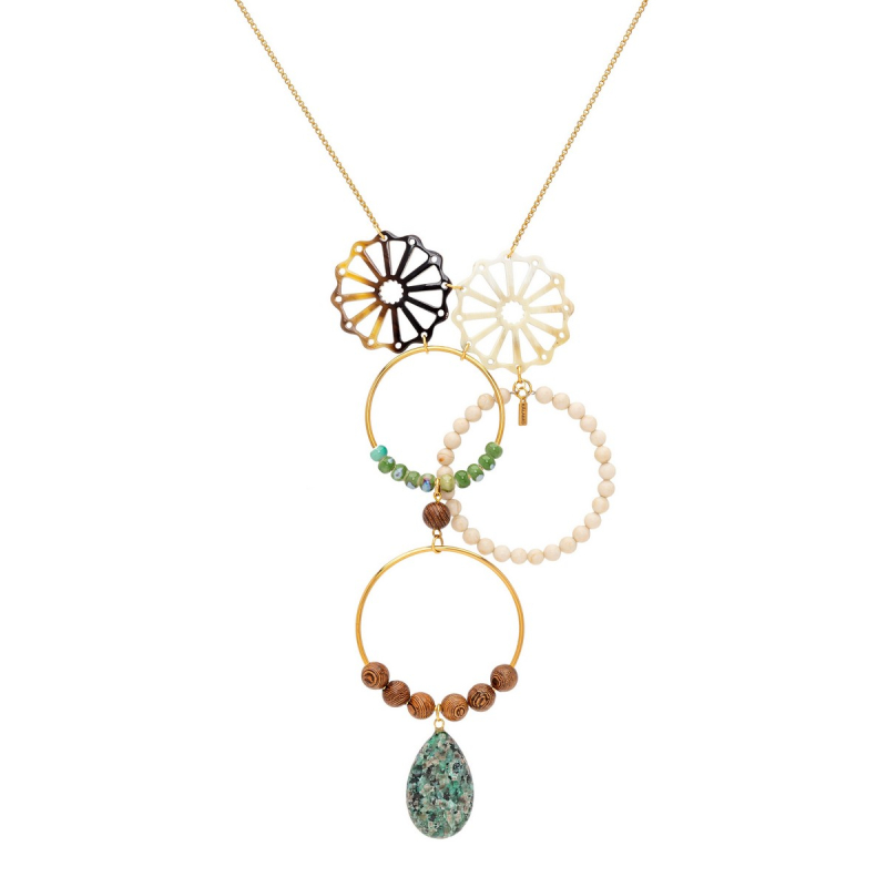 Collar Dante asimétrico con cuerno, howlita, cerámica y madera de ébano, terminado en una lágrima de turquesa africana. -Peso 58 g -Longitud 45 cm -Metal: acero bañado en oro -Al ser materiales naturales y estar trabajados a mano, pueden variar ligeramente en tamaño, forma y color.