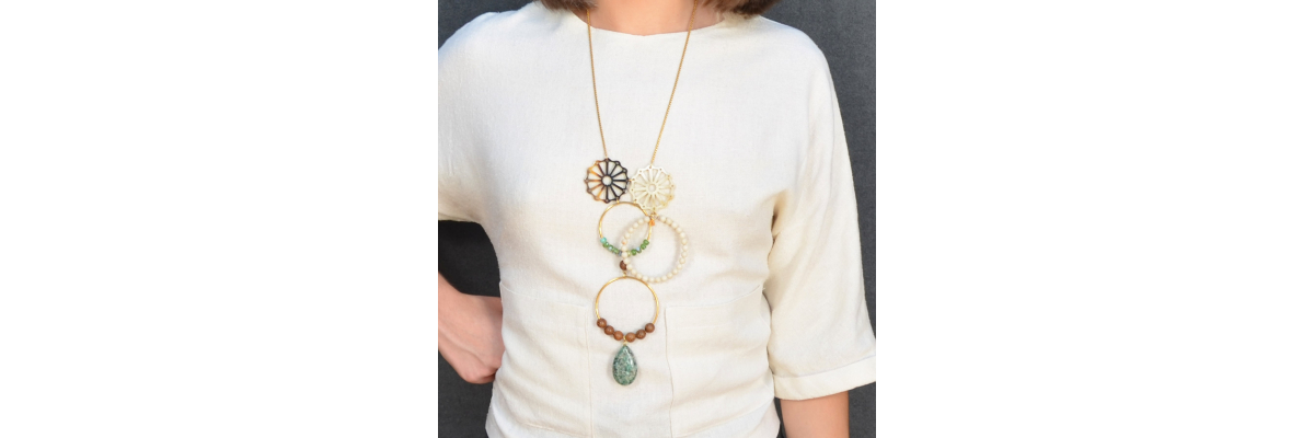 • Asymmetrical Dante necklace with horn, howlite, ceramic and ebony wood, ended in an African turquoise teardrop.