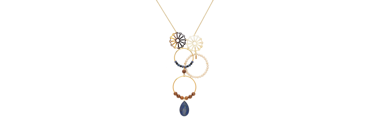 Collar Dante asimétrico con cuerno, howlita, cerámica y madera de ébano, terminado en una lágrima de lapislázuli. -Peso 58 g -Longitud 45 cm -Metal: acero bañado en oro -Al ser materiales naturales y estar trabajados a mano, pueden variar ligeramente en tamaño, forma y color.