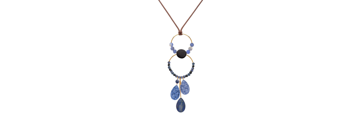 • Dante necklace with ebony, coral and howlite and three sodalite and lapis tears. It is tied around the neck with a slider chocolate brown cotton cord.