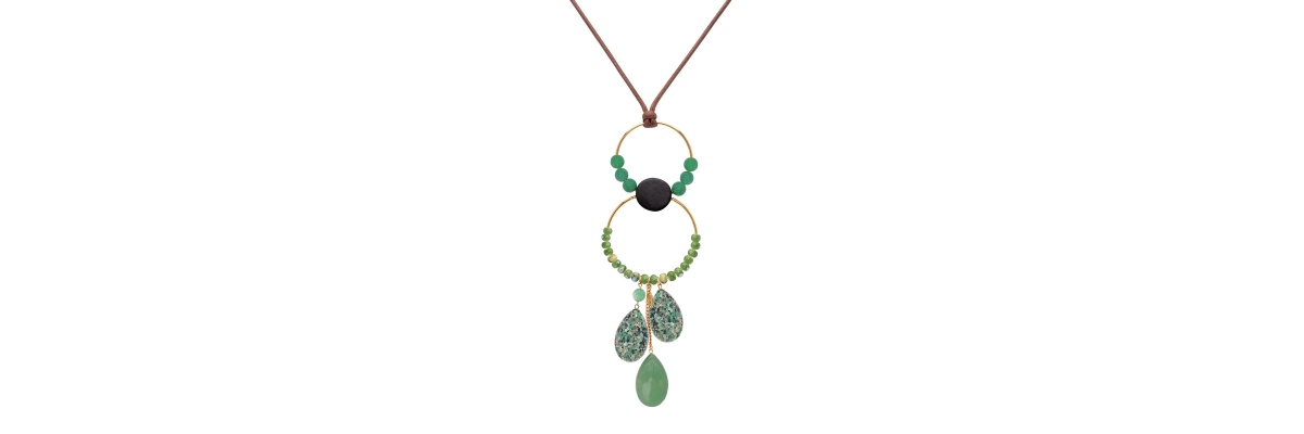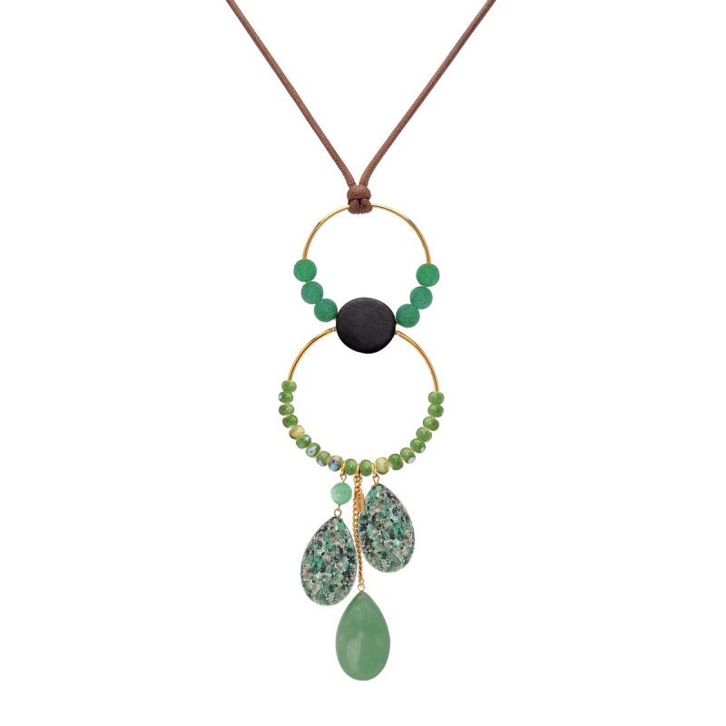 Collar Dante con ébano, coral y howlita y tres lágrimas de turquesa africana verde y jade. Está cogido al cuello con un conrdón de algodón marrón chocolate con un cierre corredizo. -Peso 103 g -Longitud ajustable de 25 a 50 cm -Metal: acero bañado en oro -Al ser materiales naturales y estar trabajados a mano, pueden variar ligeramente en tamaño, forma y color.
