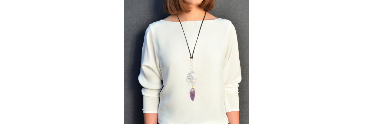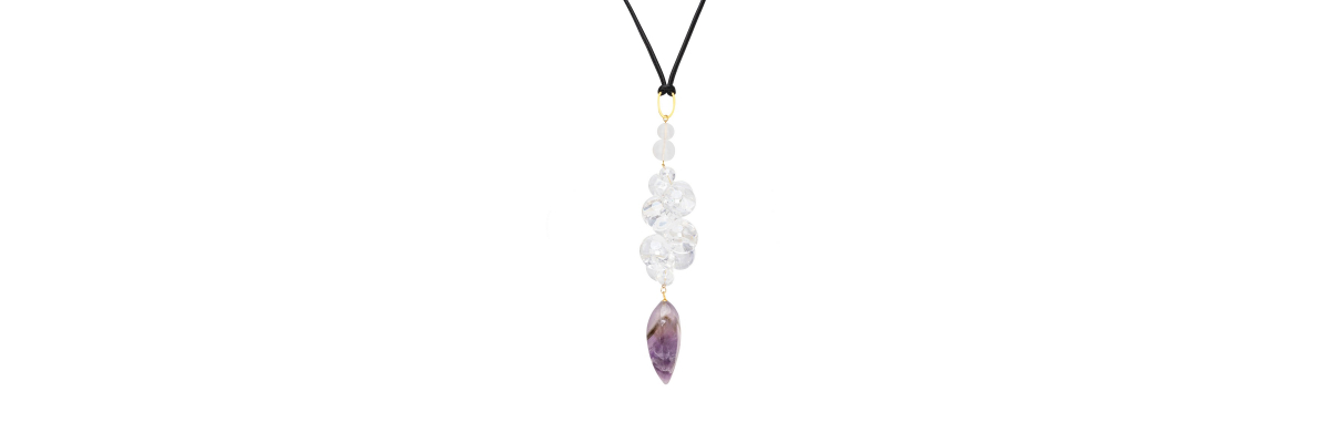 • Brunella necklace with water-based resin bubbles, matte quartz and an faceted amethyst. It ends with a leather cord and onyx.
