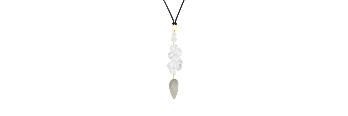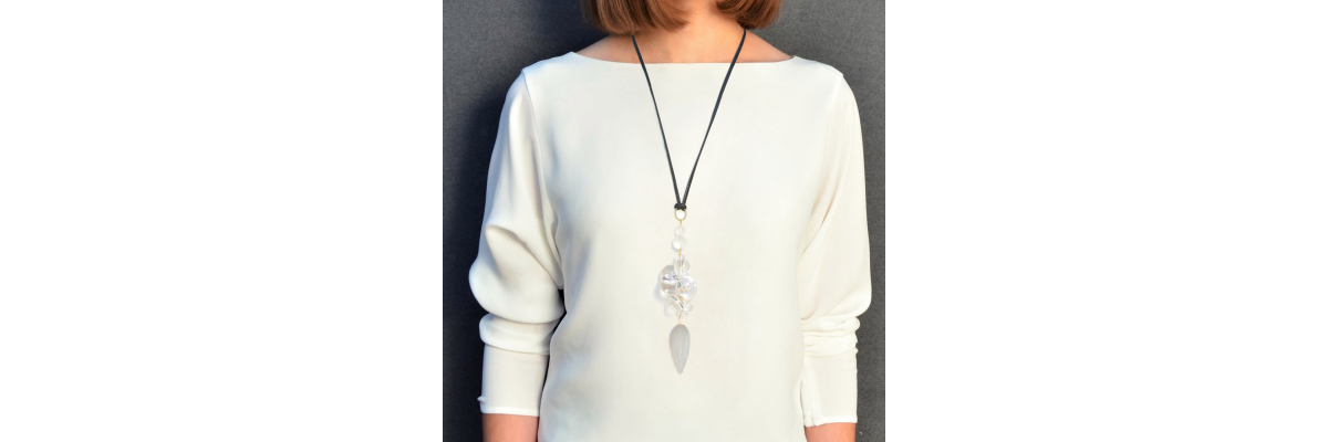 • Brunella necklace with water-based resin bubbles, matte quartz and an faceted agate. It ends with a leather cord and onyx.