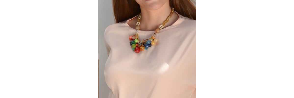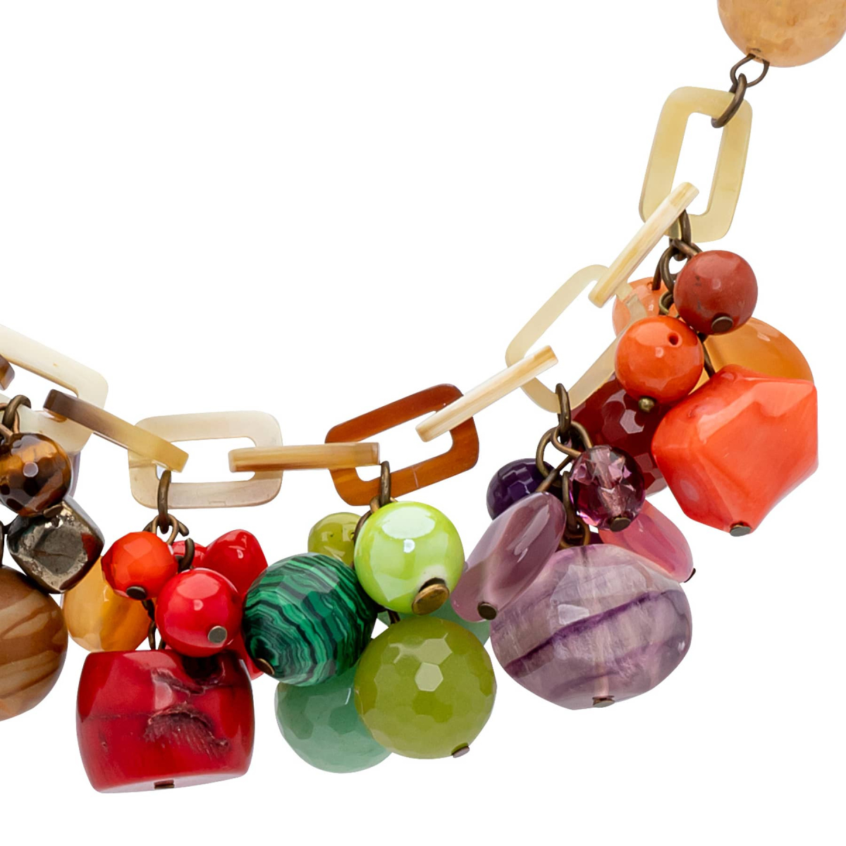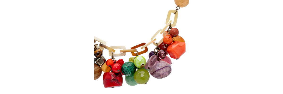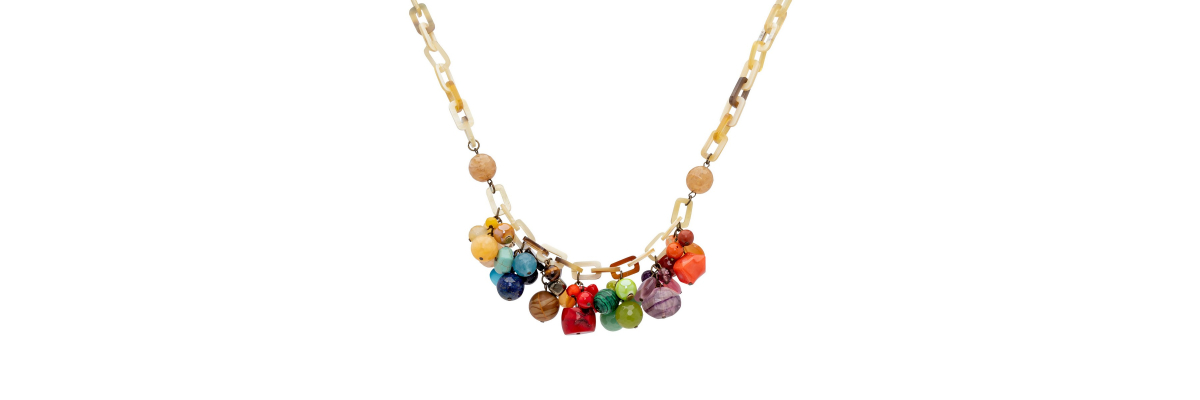 Collar Talía corto con cadena cuadrada de cuerno claro, piedras semipreciosas y otros materiales de muchos colores. Entre otros, ágata, cerámica, coral, cornalina, malaquita, amatist, ojo de tigre, jade, pirita, etc.. -Peso 118 g -Longitud 26 cm -Metal: acero bañado en oro -Al ser materiales naturales y estar trabajados a mano, pueden variar ligeramente en tamaño, forma y color.
