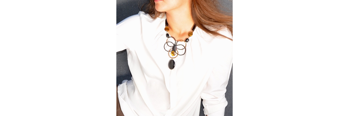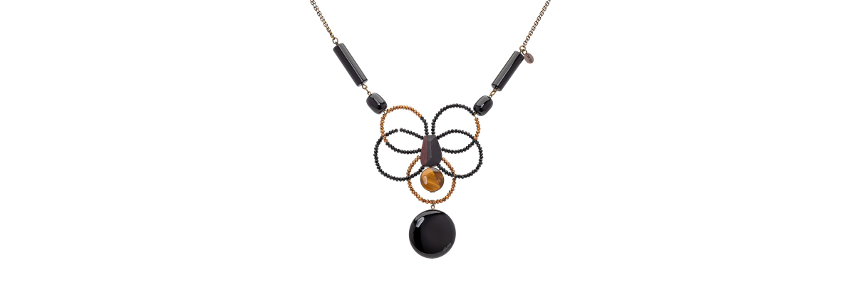 • Mara long necklace with tiger´s eye, onyx and a central wired ornament with Bohemian crystal, hematite and ebony wood.