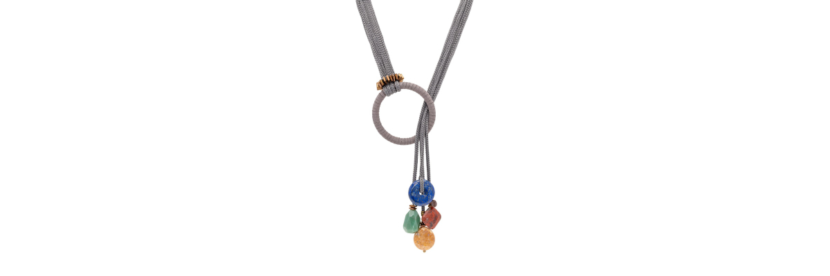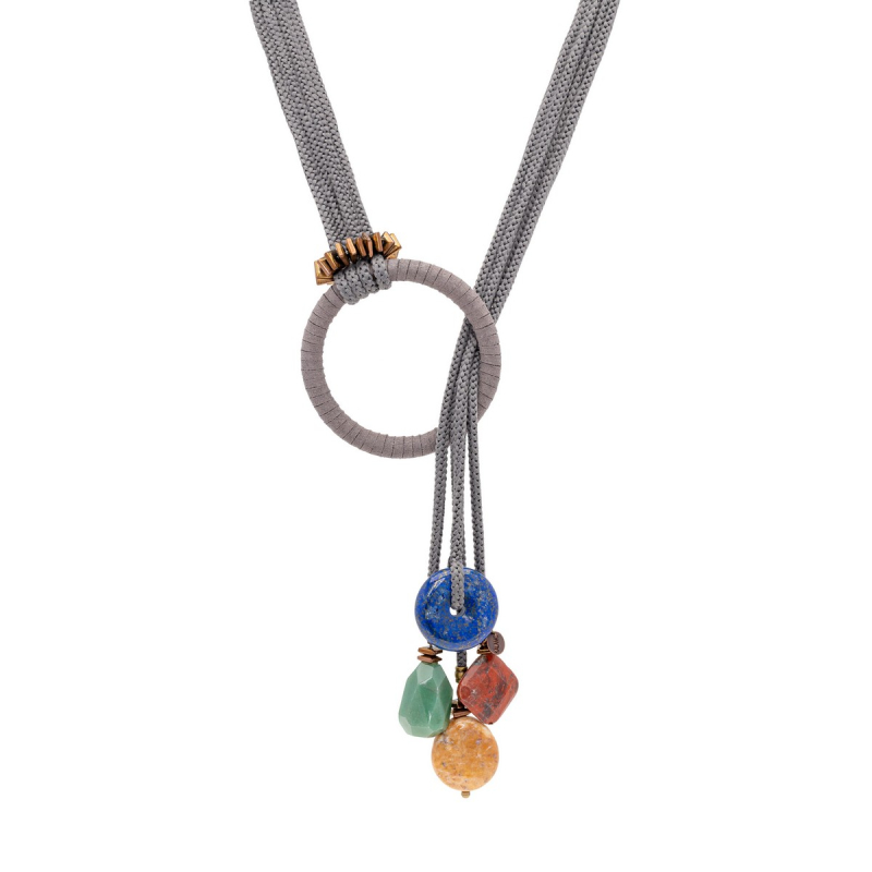 Collar Ambra con jaspe amarillo, jaspe rojo, lapislázuli, jade y hematite con cordón envolvente de color gris . -Peso 110 g -Longitud 44 cm -Metal: acero bañado en oro -Al ser materiales naturales y estar trabajados a mano, pueden variar ligeramente en tamaño, forma y color.