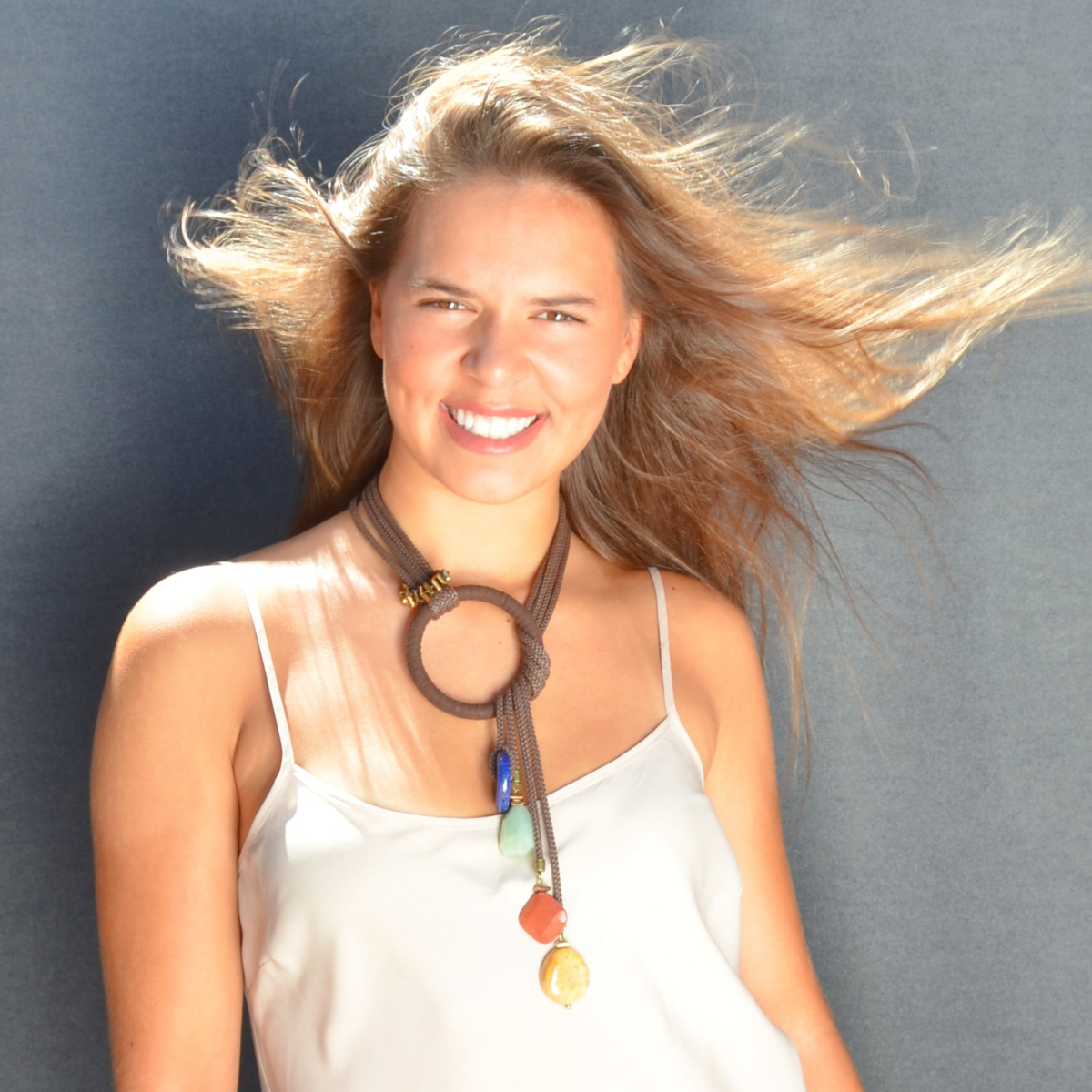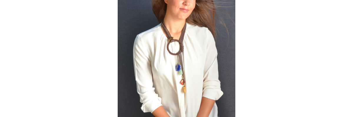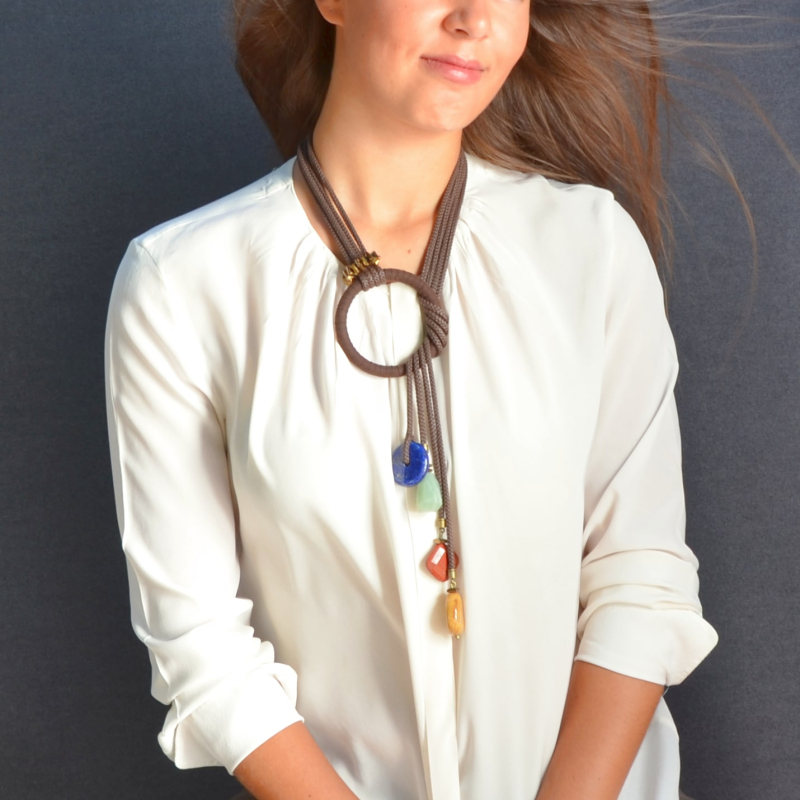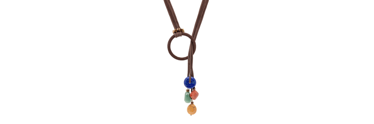 Collar Ambra con jaspe amarillo, jaspe rojo, lapislázuli, jade y hematite con cordón envolvente de color marrón chocolate. -Peso 110 g -Longitud 44 cm -Metal: acero bañado en oro -Al ser materiales naturales y estar trabajados a mano, pueden variar ligeramente en tamaño, forma y color.