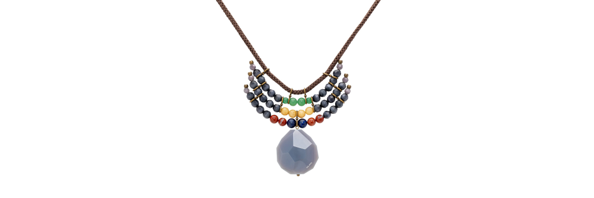 Collar corto Ambra semirígido con tres vueltas de jaspe rojo, aventurina amarilla, jade, lapislázuli, ágata y cristal de Bohemia. -Peso 130 g -Longitud 27 cm -Metal: acero bañado en oro -Al ser materiales naturales y estar trabajados a mano, pueden variar ligeramente en tamaño, forma y color.