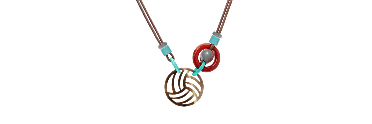 Copernico necklace with central horn piece, carnelian ring and ceramic of different shapes and colors.It is attached to the neck with a brown cotton cord ended in red jasper.