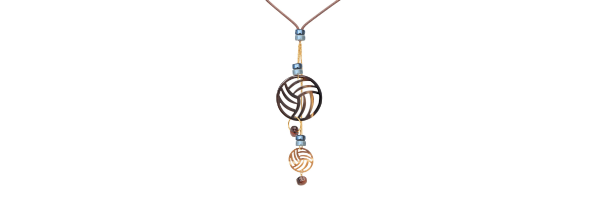 Collar Copérnico en forma de Y doble con dos colgantes de cuerno y cerámica. Está sujeto al cuello con un cordón de algodón marrón chocolate. -Peso 64 g -Longitud 50 cm -Metal: acero bañado en oro -Al ser materiales naturales y estar trabajados a mano, pueden variar ligeramente en tamaño, forma y color.