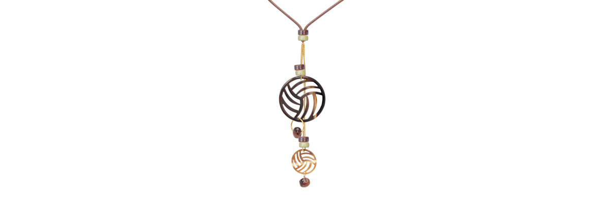 Collar Copérnico en forma de Y doble con dos colgantes de cuerno y cerámica. Está sujeto al cuello con un cordón de algodón marrón chocolate. -Peso 64 g -Longitud 50 cm -Metal: acero bañado en oro -Al ser materiales naturales y estar trabajados a mano, pueden variar ligeramente en tamaño, forma y color.