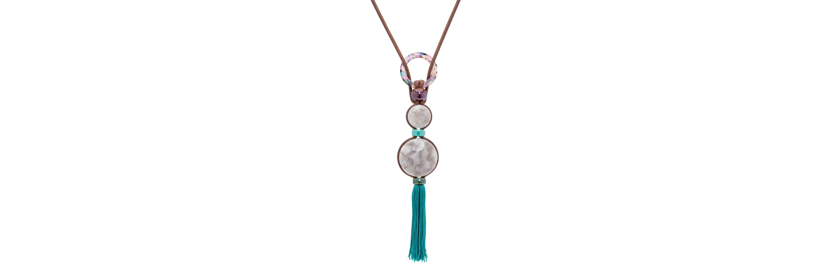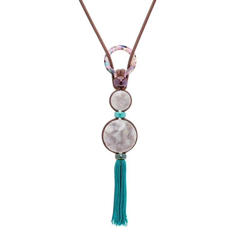 Collar Piero con dos tamaños de ágata blanca, cerámica, aro de resina y borla de seda turquesa, terminado con un cordón de algodón marrón. -Peso 138 g -Longitud 53 cm -Metal: acero bañado en oro -Al ser materiales naturales y estar trabajados a mano, pueden variar ligeramente en tamaño, forma y color.