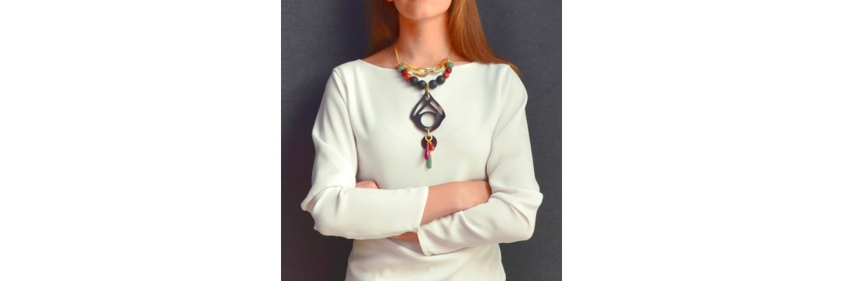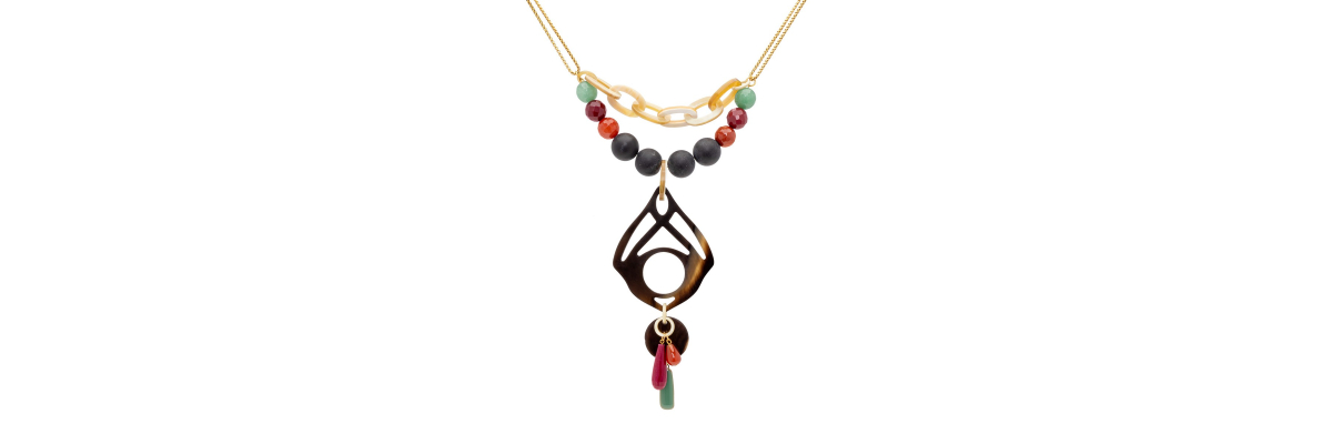 Collar Atria corto en forma de Y con ónix mate, cornalina, jade, cuarzo, ágata, esmalte y cuerno. -Peso 96 g -Longitud 35 cm -Metal: acero bañado en oro -Al ser materiales naturales y estar trabajados a mano, pueden variar ligeramente en tamaño, forma y color.