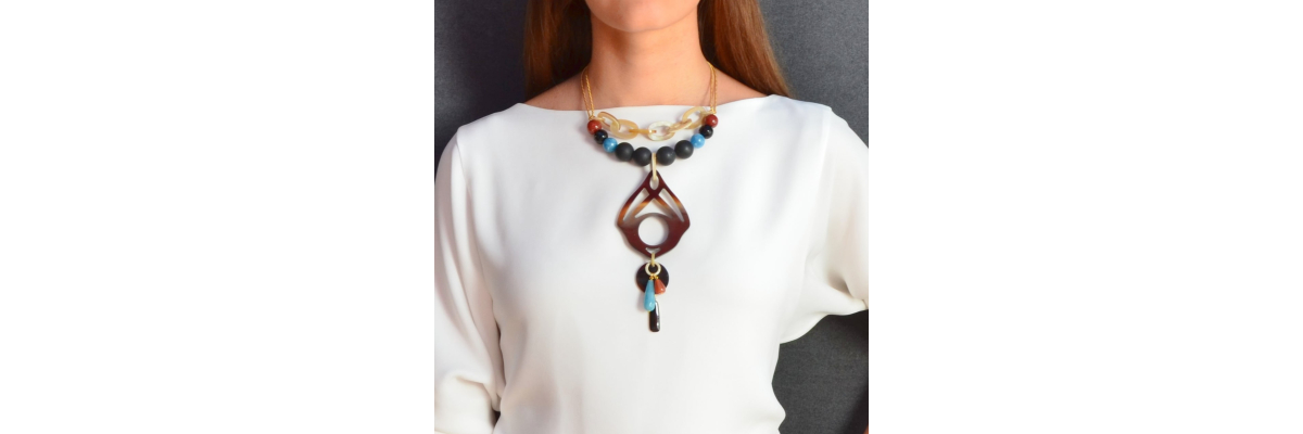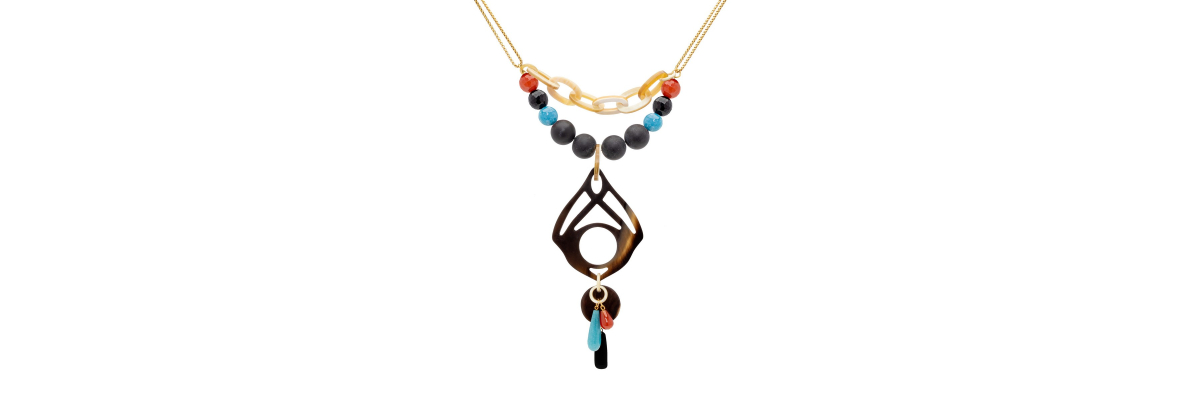 Collar Atria corto en forma de Y con ónix mate y brillante, cornalina, jade, ágata, esmalte y cuerno. -Peso 96 g -Longitud 35 cm -Metal: acero bañado en oro -Al ser materiales naturales y estar trabajados a mano, pueden variar ligeramente en tamaño, forma y color.