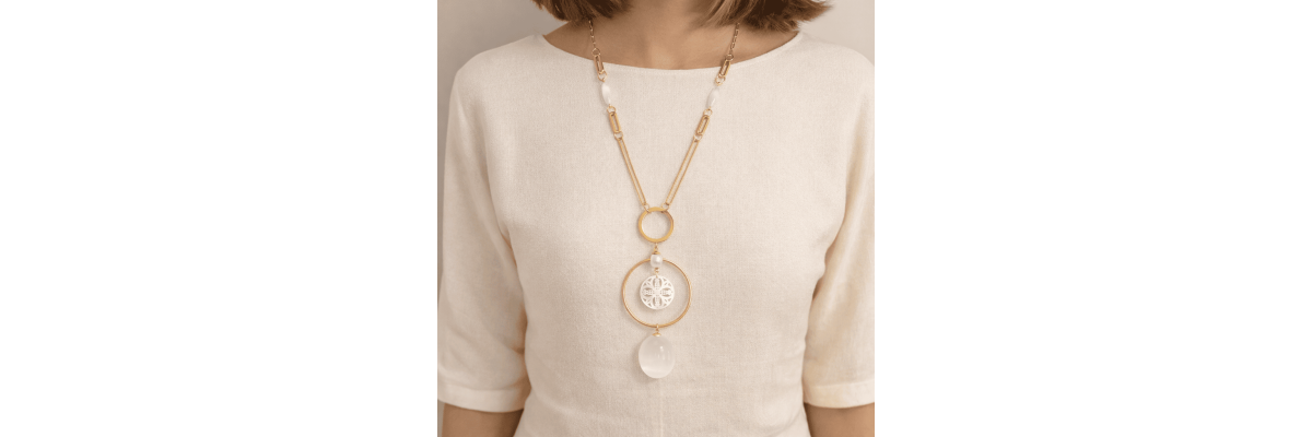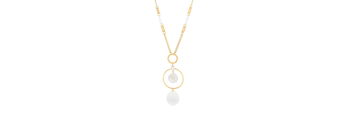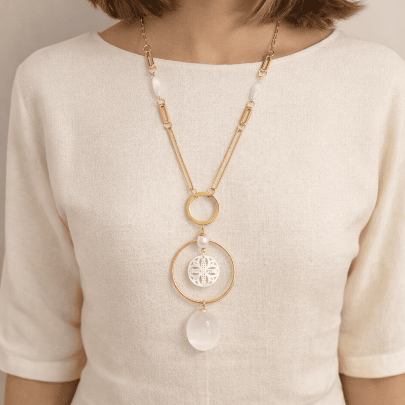 Collar largo Anna con cadena, cristal ojo de gato, perla de agua dulce, selenita y nácar calado. -Peso 69 g -Longitud 46 cm -Metal: acero bañado en oro -Al ser materiales naturales y estar trabajados a mano, pueden variar ligeramente en tamaño, forma y color.