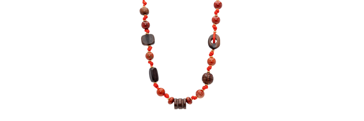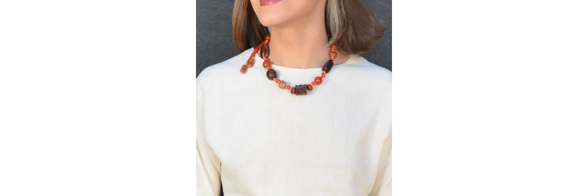 • Livia short necklace with ebony and red jasper, knoted in red textile cord.