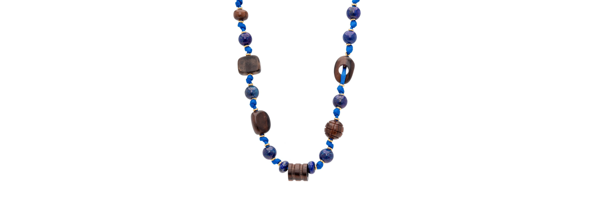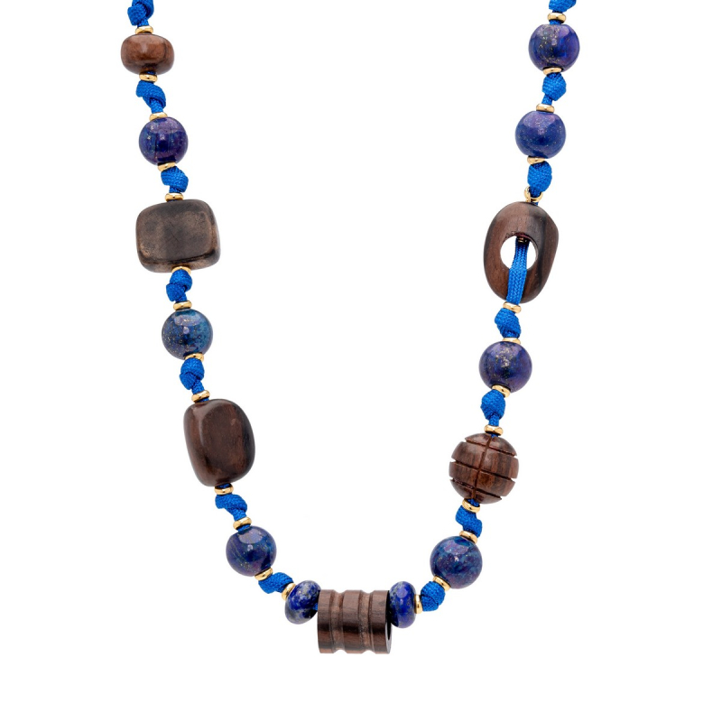 Collar Livia corto de madera de ébano y lapislázuli, en cordón textil anudado azul. -Peso 83 g -Longitud 24 cm -Metal: acero bañado en oro -Azul/marrón -Al ser materiales naturales y estar trabajados a mano, pueden variar ligeramente en tamaño, forma y color.