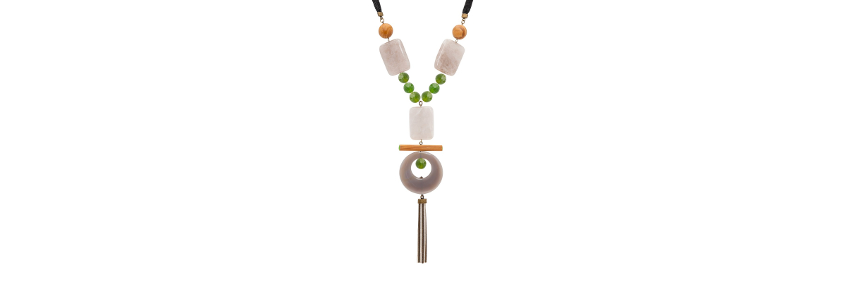 • Kimi necklace with green agates, bamboo, grey quartz, landscape jasper and black cord.
