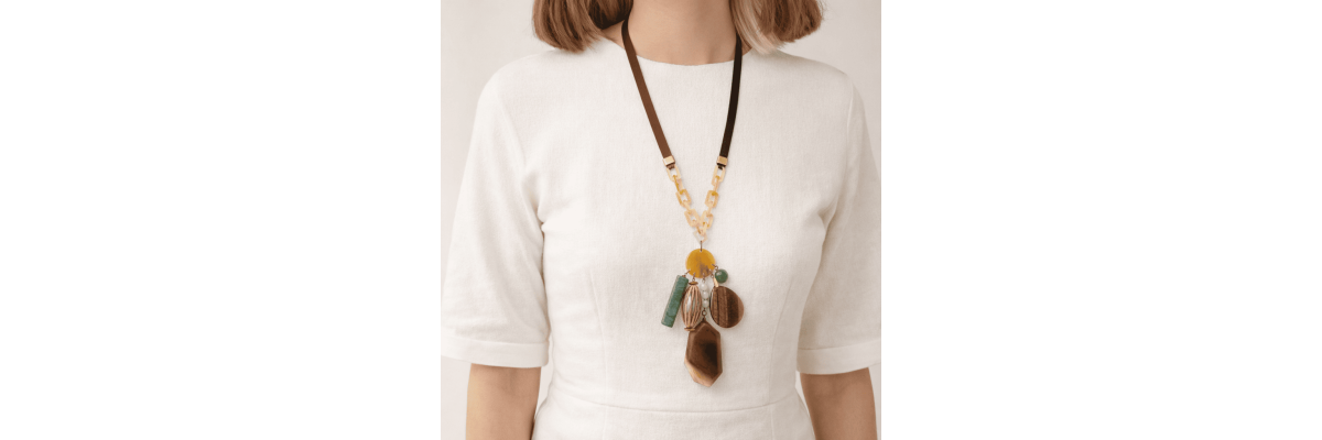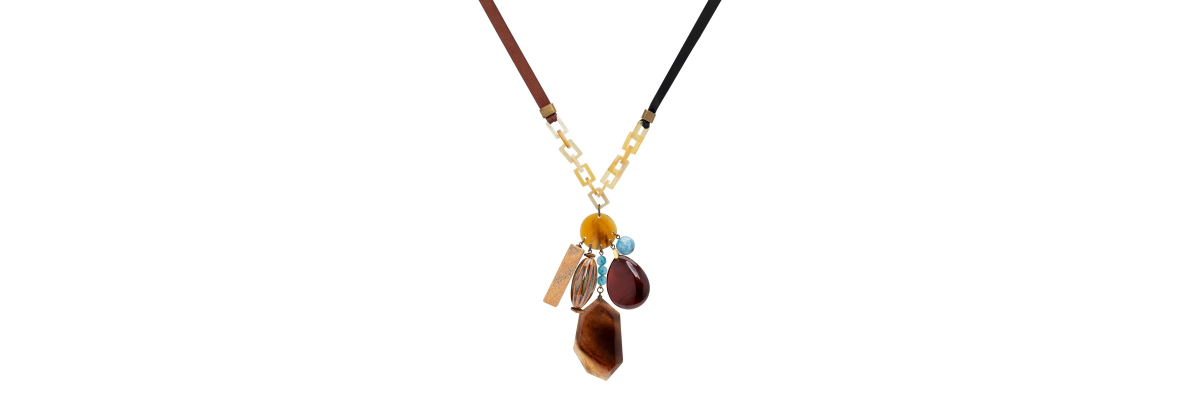 Collar Manny en forma de Y con cadena de cuerno de búfalo, ágatas, cerámica gallonada, jaspe paisaje y cinta de grossgrain en dos colores. -Peso 93 g -Longitud 50 cm -Metal: aleación dorado viejo -Azul/negro/marrón -Al ser materiales naturales y estar trabajados a mano, pueden variar ligeramente en tamaño, forma y color.