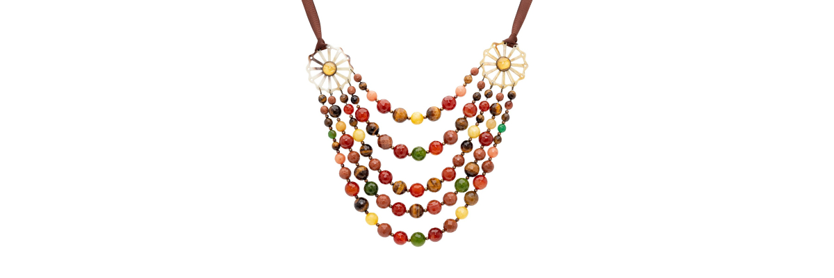 • Claudia multi-strand orange necklace with semiprecious stones like cornelian, agates, aventurine, tiger's eye, buffalo horn, Bohemian crystal and grossgrain ribbon.