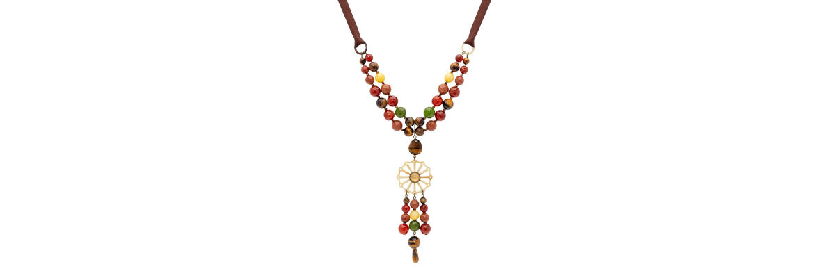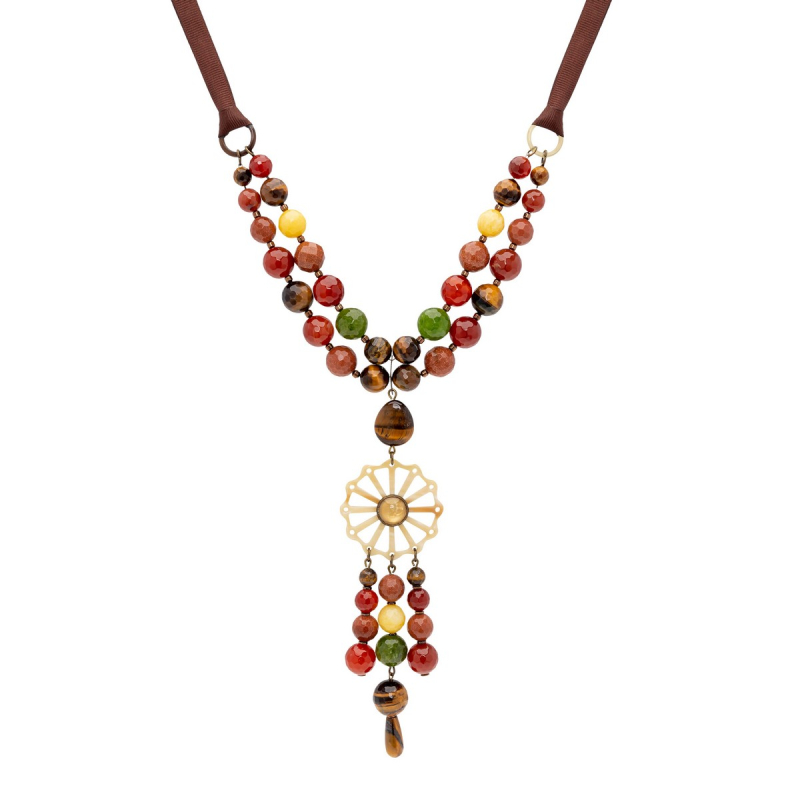 • Claudia long orange necklace with semiprecious stones like cornelian, agates, aventurine, tiger's eye, buffalo horn, Bohemian crystal and grossgrain ribbon.