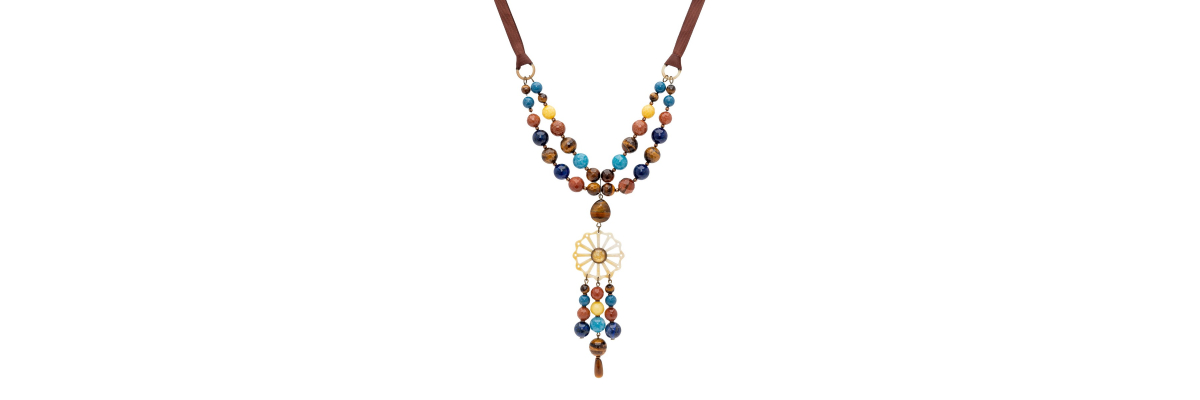 Collar Claudia largo con lapislázuli, ágatas, ojo de tigre,aventurina, cuerno de búfalo ,cristal de Bohemia y cinta de grossgrain. -Peso 140 g -Longitud 50 cm -Metal: aleación dorado viejo -Azul/amarillo/marrón -Al ser materiales naturales y estar trabajados a mano, pueden variar ligeramente en tamaño, forma y color.