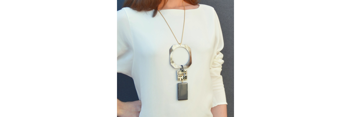 Collar Lina largo con mosaico de nàcar, cuerno de búfalo y ónix. -Peso 65 g -Longitud 48 cm -Metal: acero bañado en oro -Negro/gris -Al ser materiales naturales y estar trabajados a mano, pueden variar ligeramente en tamaño, forma y color.