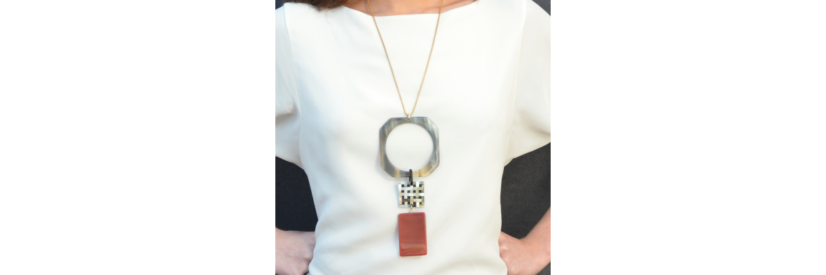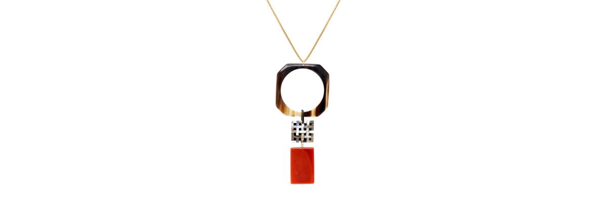 • Lina long necklace with carnelian, horn and mother-of-pearl mosaic patern.