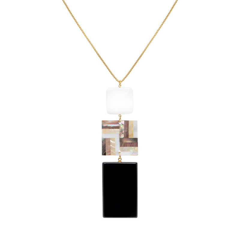 Collar Lina con mosaico de nácar de 3 colores, jade blanco y ónix. -Peso 64 g -Longitud 48 cm -Metal: acero bañado en oro -Negro/gris/blanco -Al ser materiales naturales y estar trabajados a mano, pueden variar ligeramente en tamaño, forma y color.