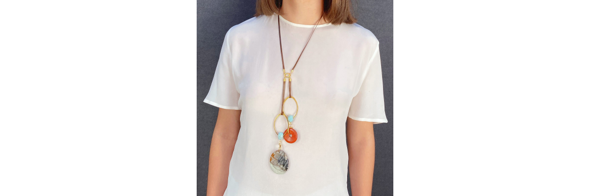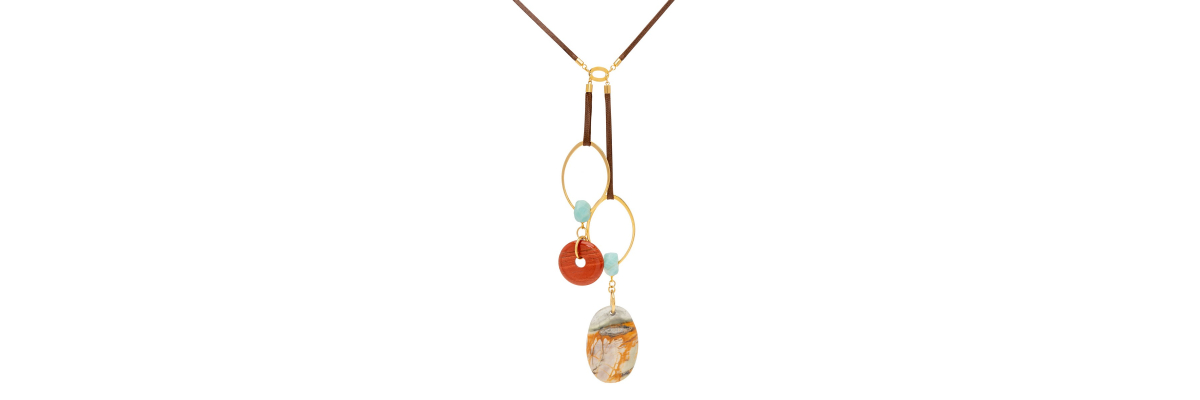 Collar Ava con dos colgantes de jaspe rojo, jaspe picasso y larimar. -Peso 78 g -Longitud 50 cm -Metal: acero bañado en oro -Marrón/multicolor -Al ser materiales naturales y estar trabajados a mano, pueden variar ligeramente en tamaño, forma y color.