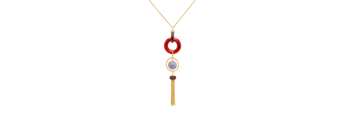 Collar Erin con aro gigante de cornalina, colgante con amatista y borla con ébano. -Peso 78 g -Longitud 45 cm -Metal: acero bañado en oro -Marrón/morado -Al ser materiales naturales y estar trabajados a mano, pueden variar ligeramente en tamaño, forma y color.