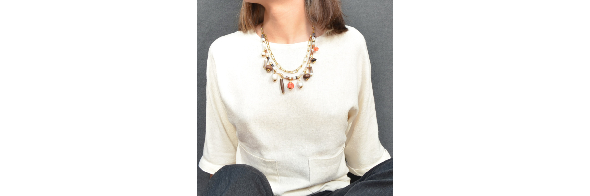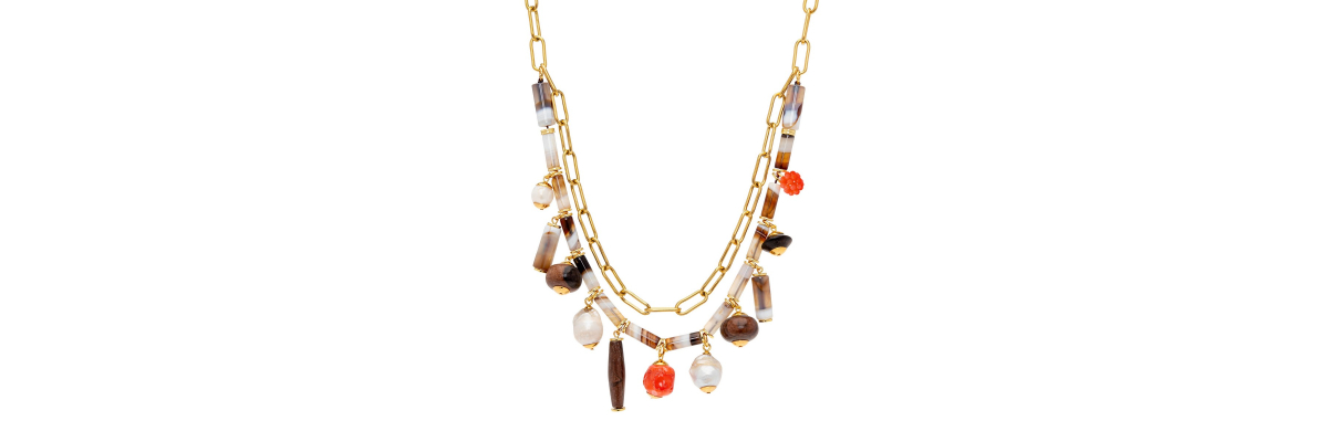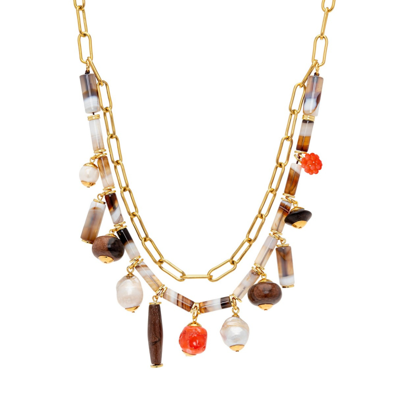 Collar corto Bel con colgantes de coral, perlas barrocas, ébano y ágatas. -Peso 83 g -Longitud 29 cm -Metal: acero bañado en oro -Marrón/naranja/blanco -Al ser materiales naturales y estar trabajados a mano, pueden variar ligeramente en tamaño, forma y color.