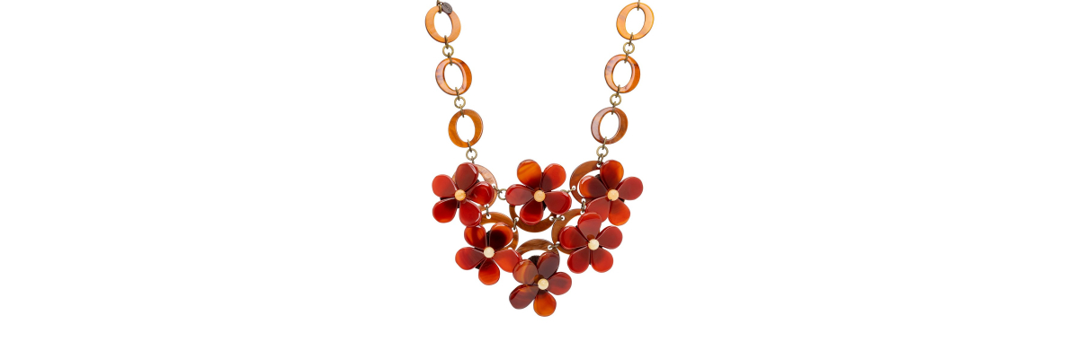 Collar Cristina con flores de cornalina, aros de resina y aventurina amarilla. -Peso 159 g -Longitud 26 cm -Metal: aleación dorado viejo -Naranja -Al ser materiales naturales y estar trabajados a mano, pueden variar ligeramente en tamaño, forma y color.