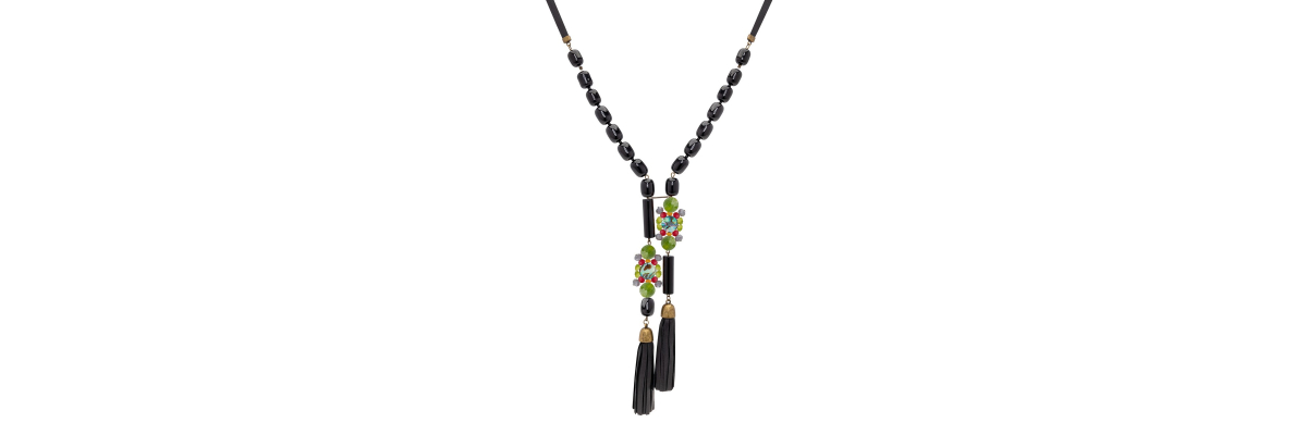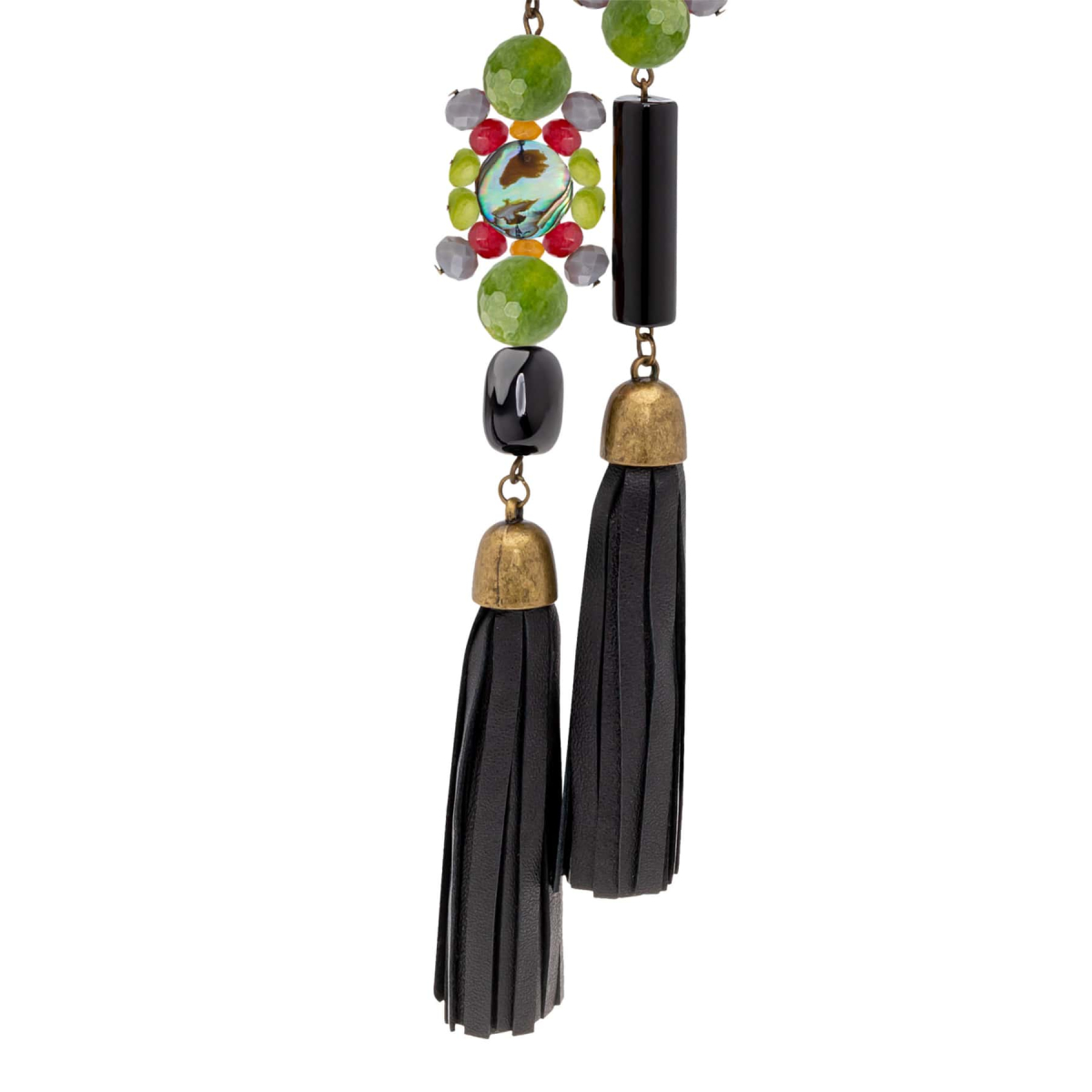 Collar Inna con dos borlas de napa negro, ónix, ágatas y nácar ábalon. -Peso 128 g -Longitud 50 cm -Metal: aleación dorado viejo -Negro/verde -Al ser materiales naturales y estar trabajados a mano, pueden variar ligeramente en tamaño, forma y color.