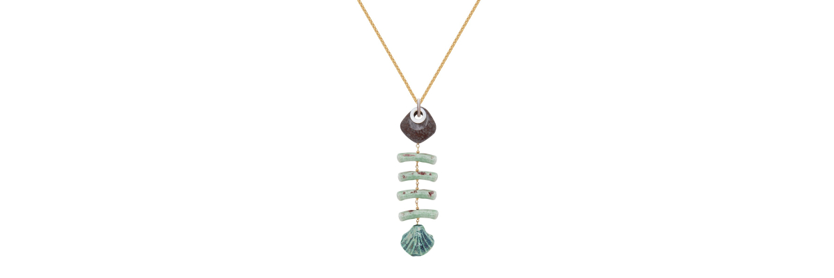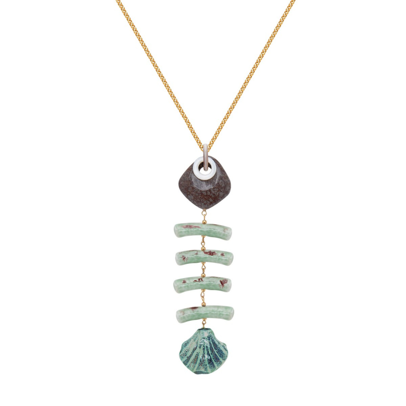 NAUPLIA FOSSIL CORAL AND CERAMIC FISH LONG NECKLACE GREEN