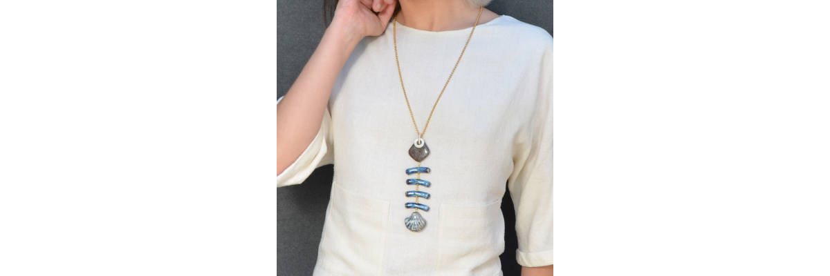 • Nauplia long necklace with ceramic, jasper and mother-of-pearl fish.