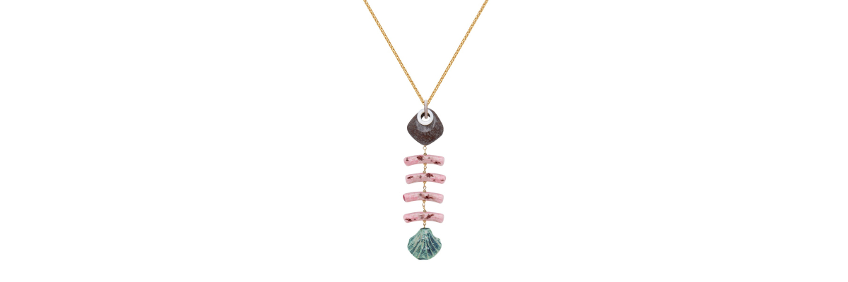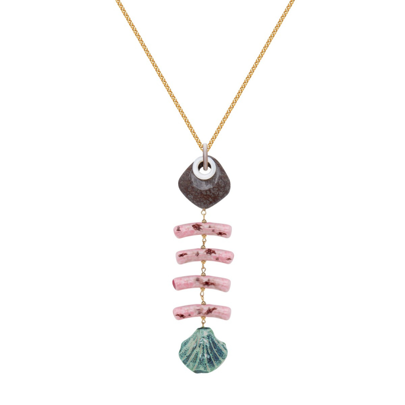 Collar Nauplia con pez de cerámica, jaspe y nácar tallado. -Peso 56 g -Longitud 48 cm -Metal: acero bañado en oro -Rosa -Al ser materiales naturales y estar trabajados a mano, pueden variar ligeramente en tamaño, forma y color.