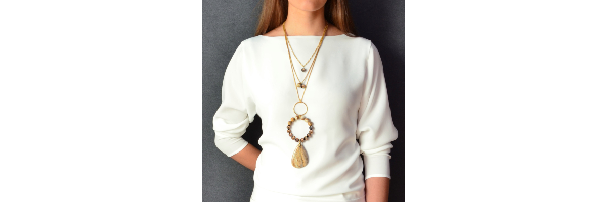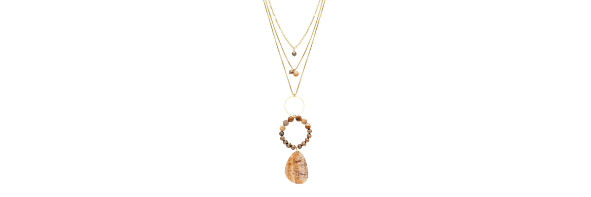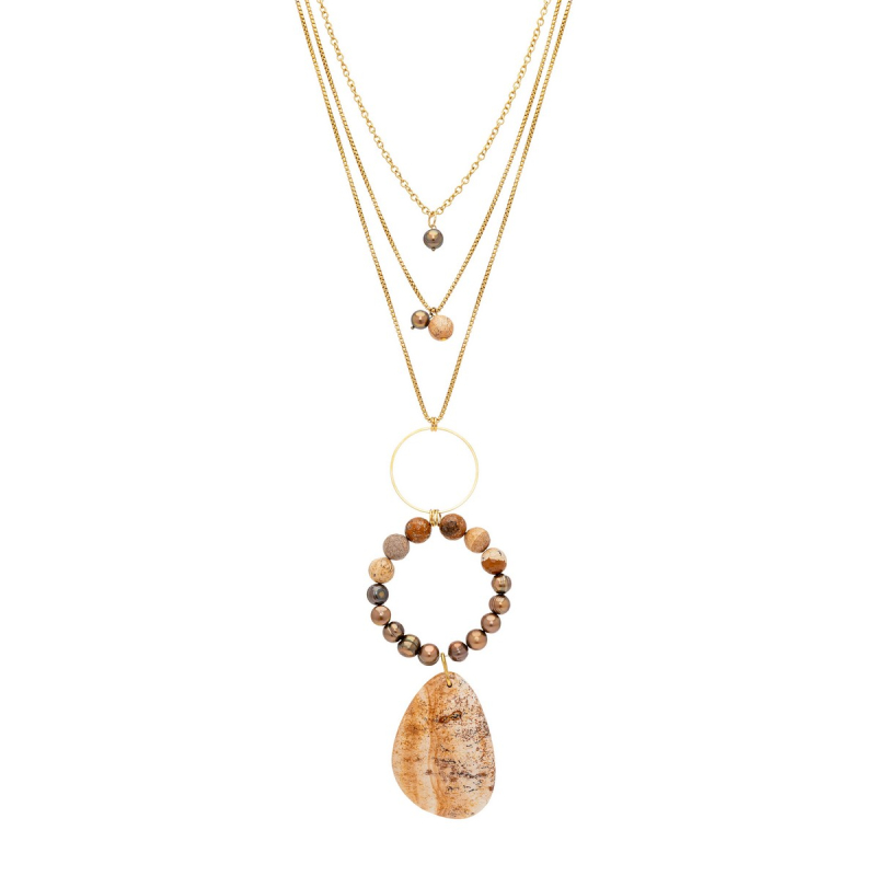 Collar OIA de tres vueltas con perlas doradas y colgante central de jaspe paisaje en forma de gota. -Peso 102 g -Longitud 50 cm -Metal: acero bañado en oro -Dorado/beige/dorado -Al ser materiales naturales y estar trabajados a mano, pueden variar ligeramente en tamaño, forma y color.