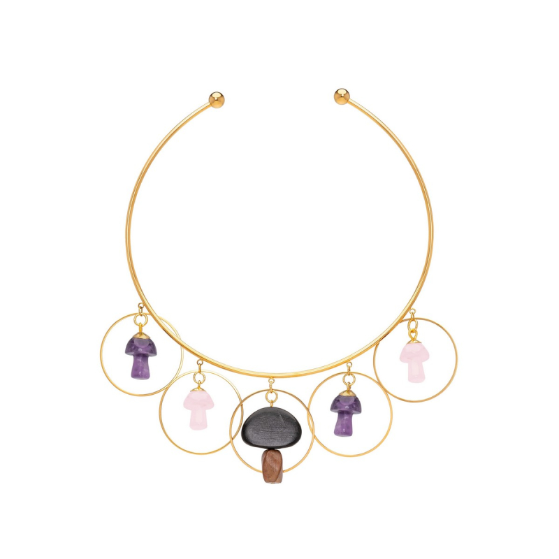 • Davinia rigid short necklace with pink quartz, amethyst and ebony wood mushrooms.